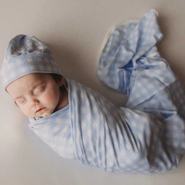 Snuggly Jacks Jersey Wrap and Beanie – Cornflower Gingham