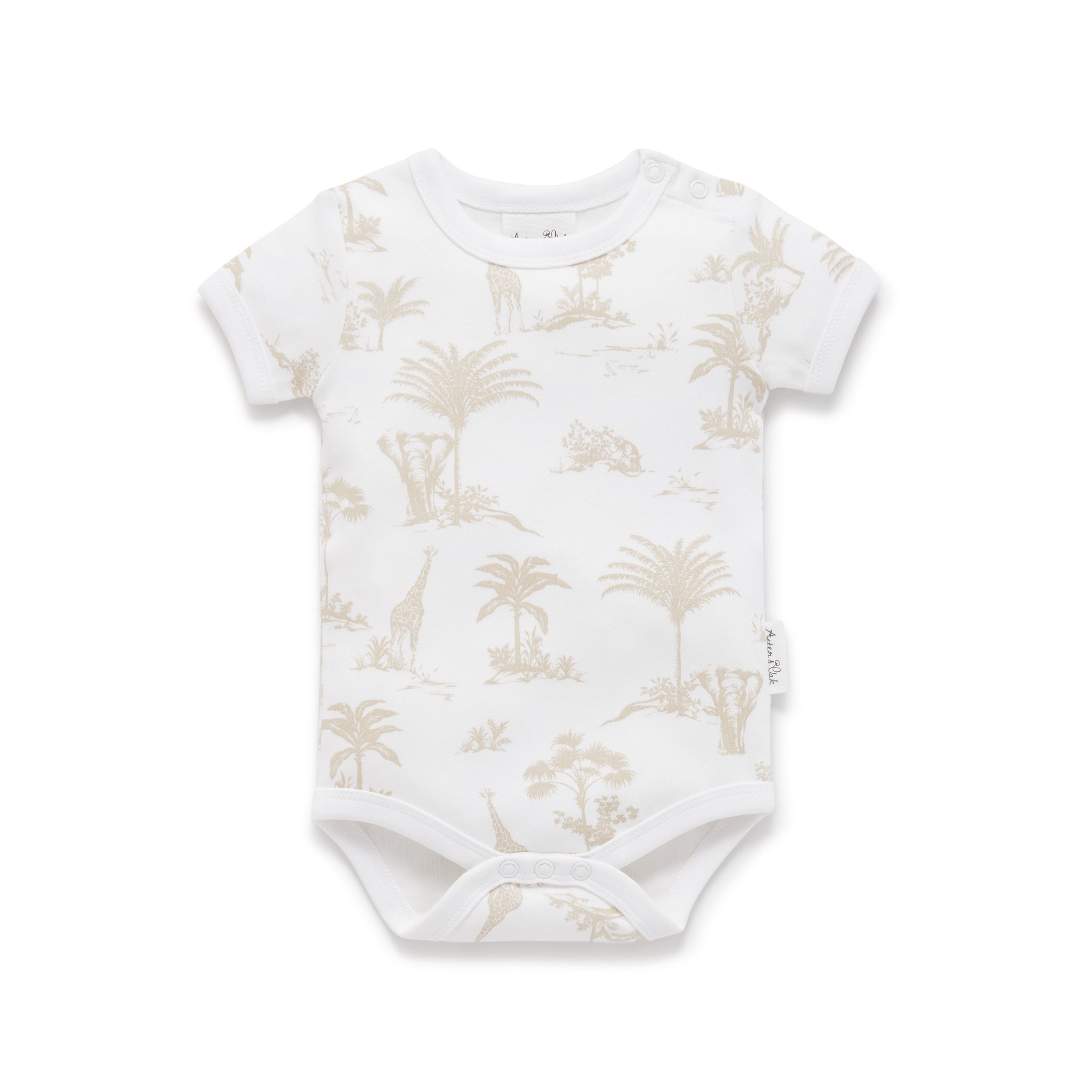 Made with GOTS certified organic cotton, the Jungle AOP Onesie features hand-illustrated print, short sleeves, 2 snap buttons on the shoulder and 3 snaps along the bottom.