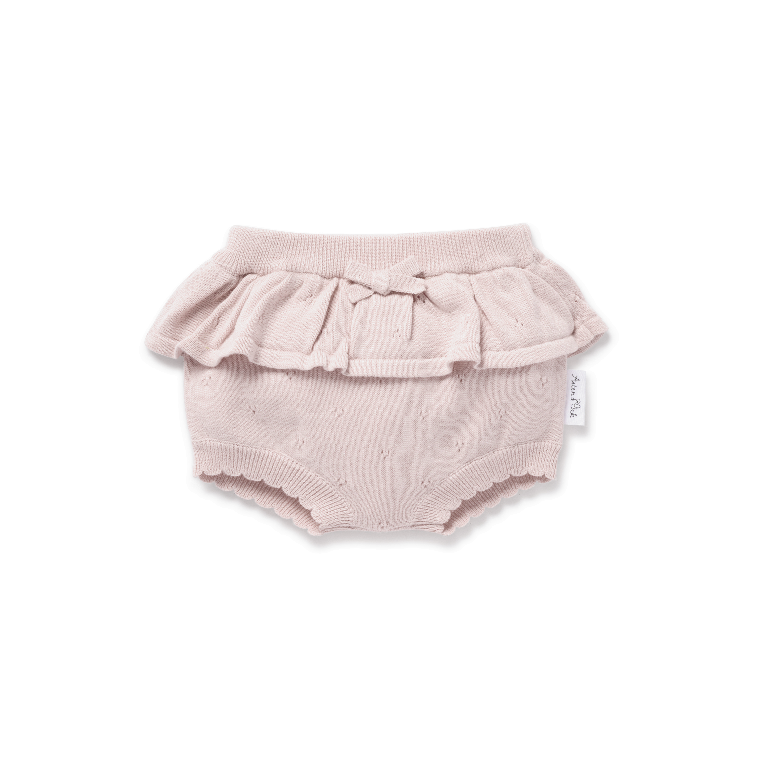 Made with 100% organic cotton, the rose blush knit bloomers, feature pointelle stitching and a large all round frill with bow to waist. Generous in size to accommodate various nappy sizes.