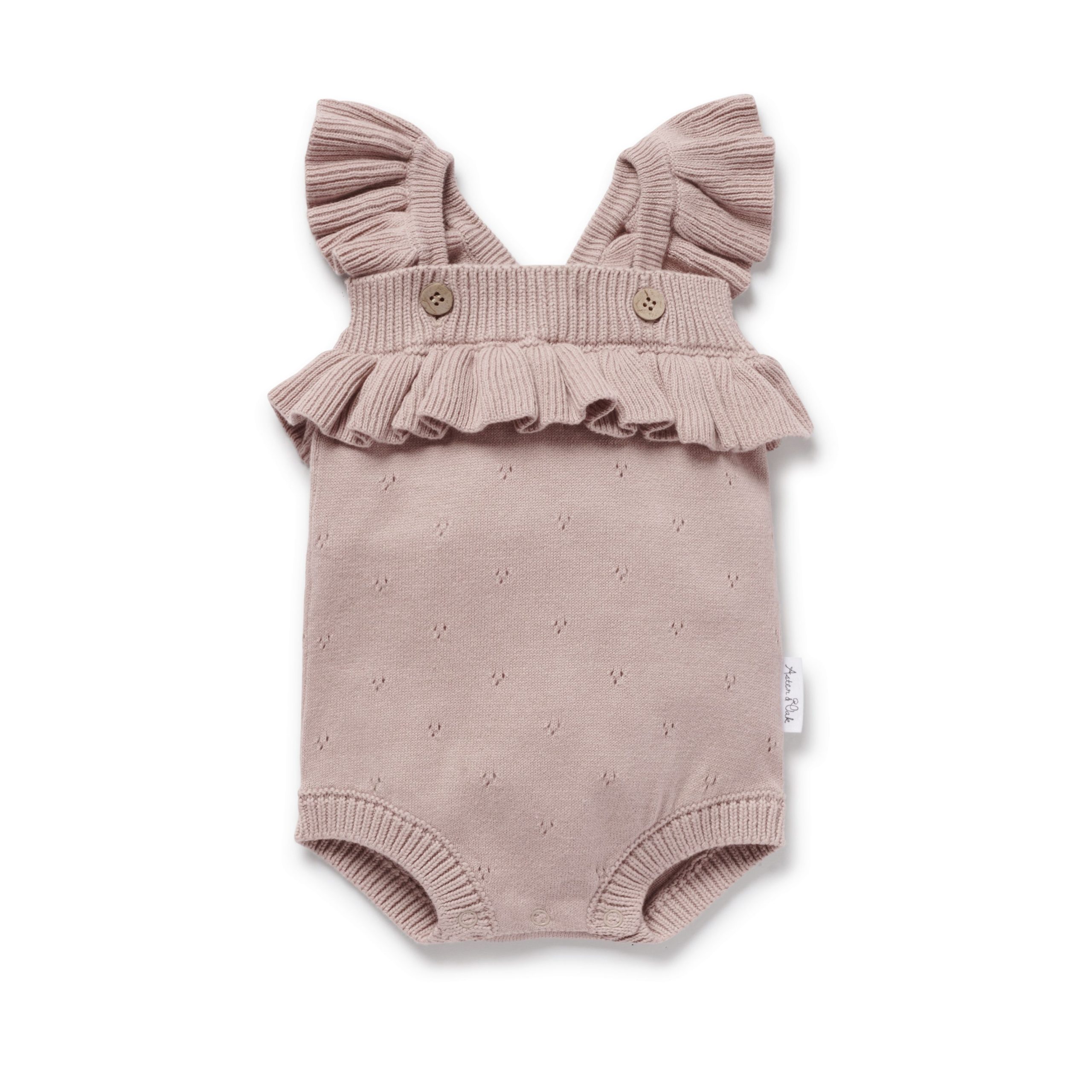 Made from 100% organic cotton, the knit romper features pointelle stiching, crossover flutter straps, wrap around frill to chest,and snap buttons to bottom.