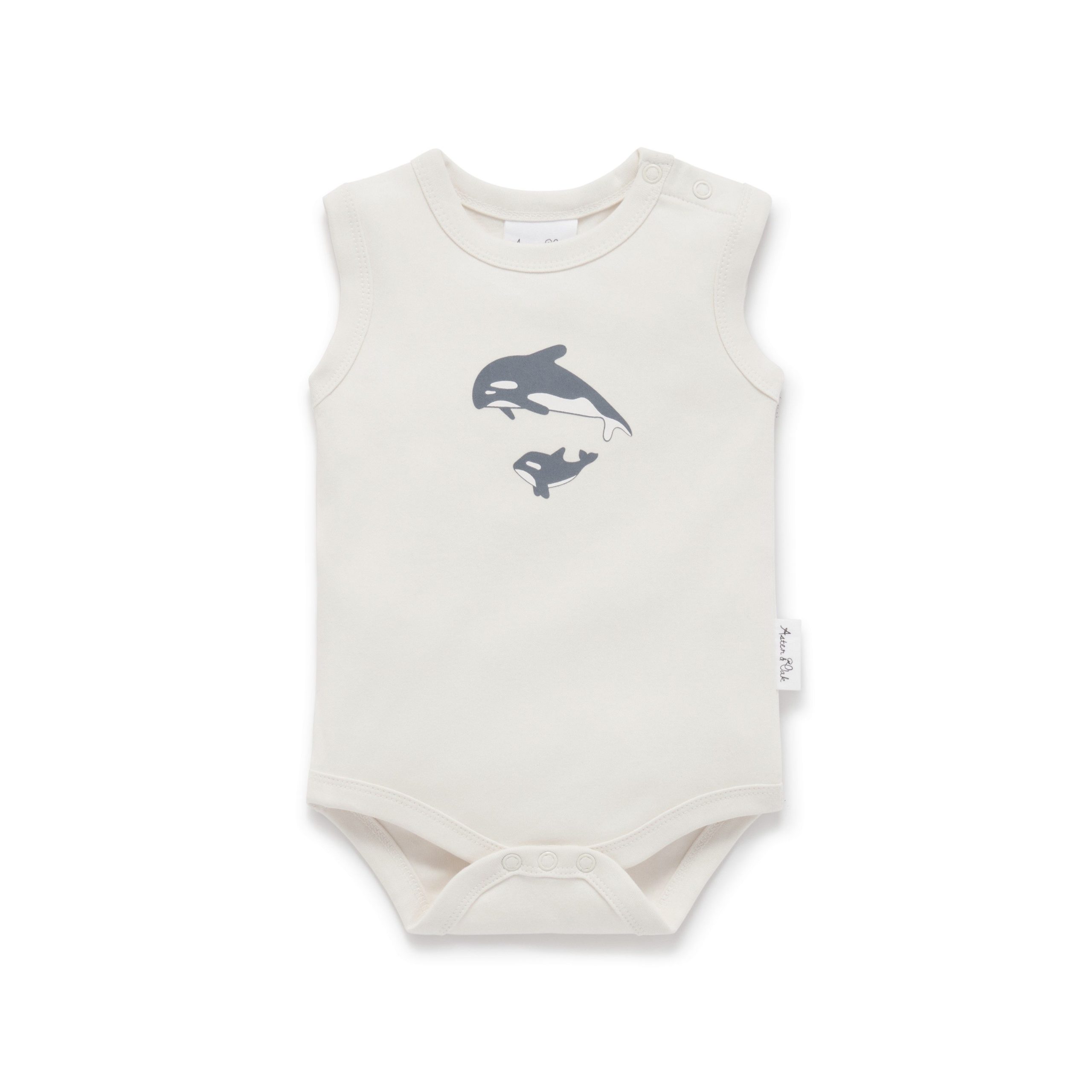 Made with GOTS certified organic cotton, the Orca Print Singlet Onesie is sleeveless with a central orca design and snap buttons for easy changes.