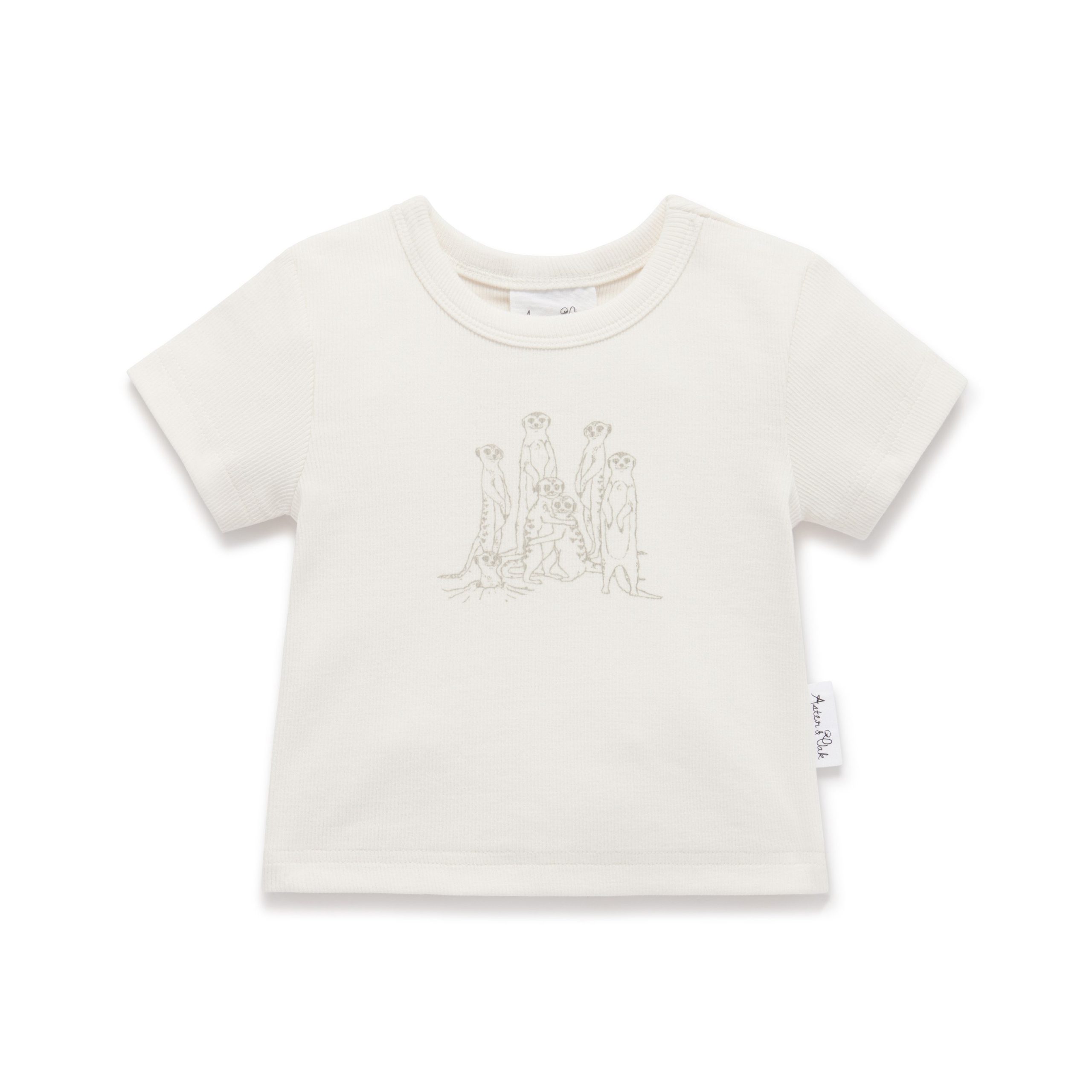 Made from GOTS certified organic cotton. The Meerkat Print Rib Tee features a stretchy neckline and central meerkat print.
