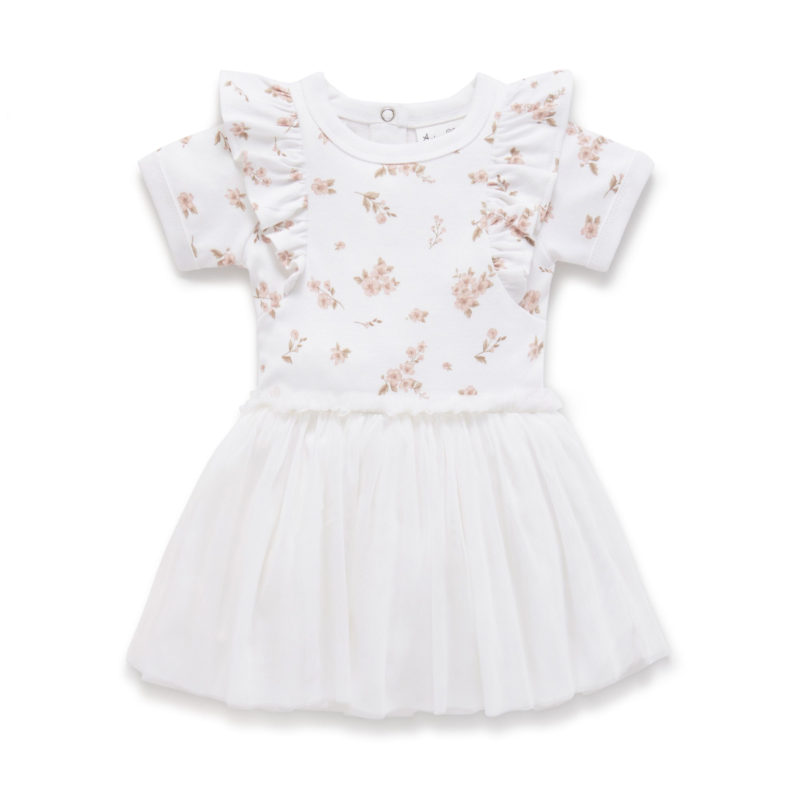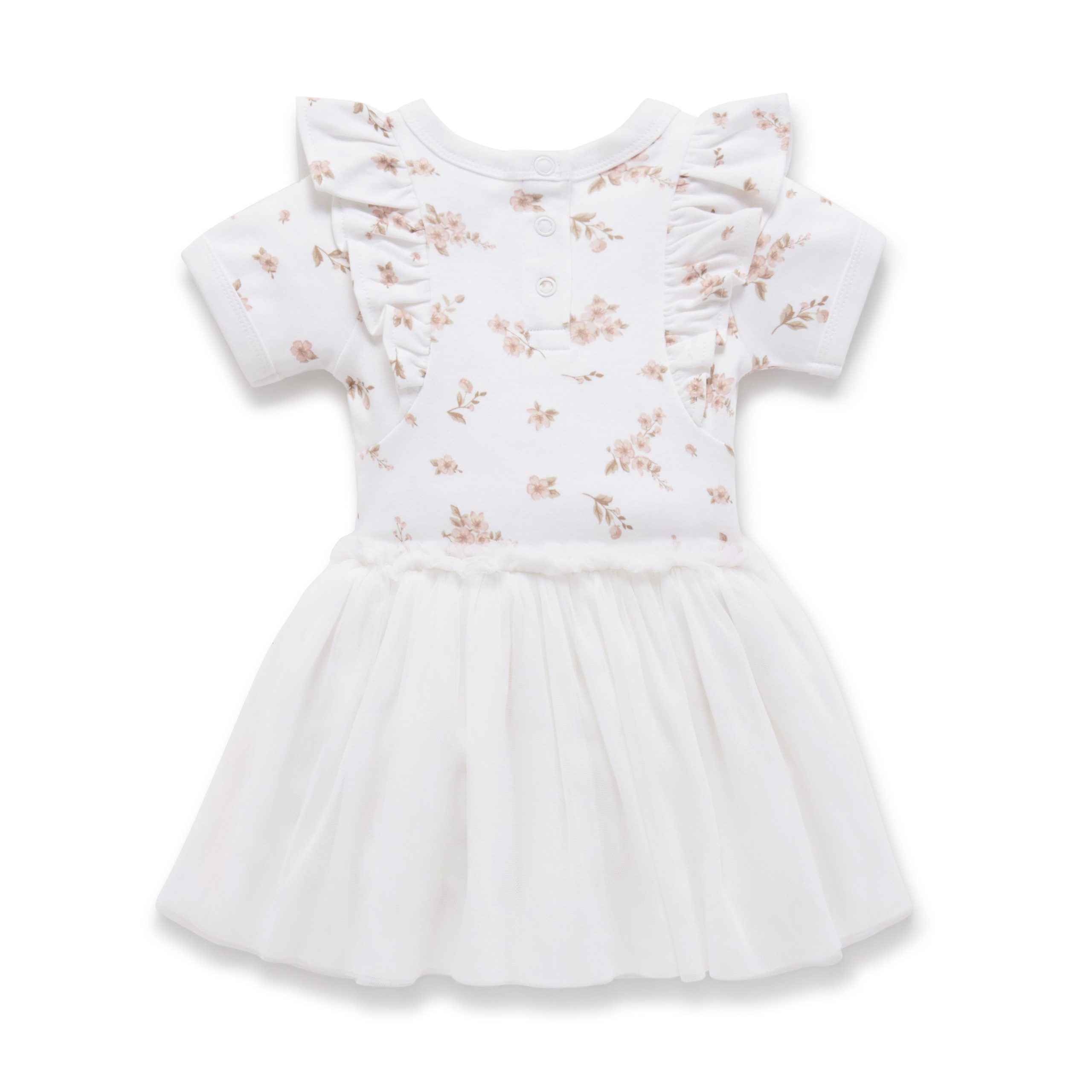 Made with GOTS certified organic cotton, this hand-illustrated Blossom Tutu Dress features beautiful ruffle to the shoulder, short sleeves and four contrasting layers of the softest tulle, three snap buttons down the back and a full flared skirt.