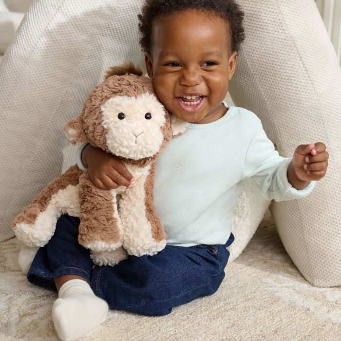 Cozys are irresistible companions made from super soft textured fabrics sure to provide endless cuddles and snuggles! Cozys have been designed to sit nicely on shelf with new body positioning. This Cozys Monkey sits at 29cm and features light and dark brown fur.