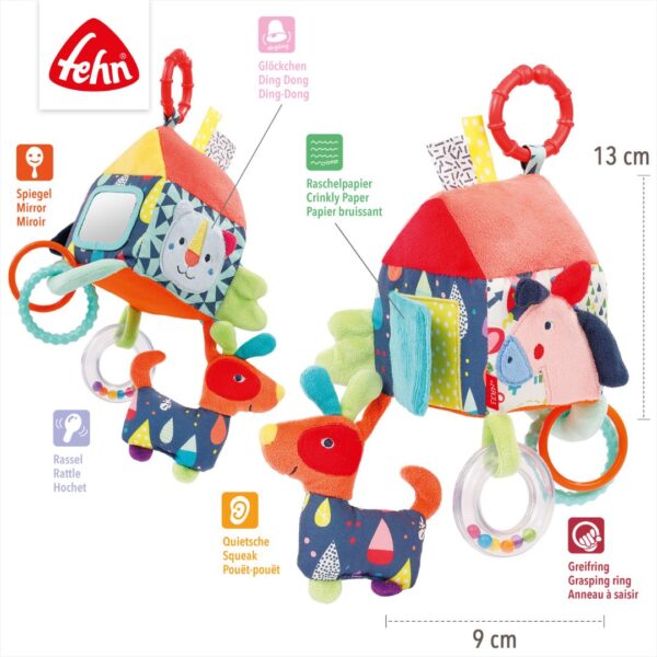 The Activity House is a soft and interactive toy for babies aged 0+ months, designed to promote sensory exploration and motor skill development. Featuring a rattle, crinkly paper, mirror, squeaky dog, and colourful grasping rings, it encourages touch, hearing, and hand-eye coordination. With a practical C-ring for easy attachment to prams, car seats, or play gyms, it’s perfect for play at home or on the go and makes an ideal gift for baby showers, birthdays, or special occasions.