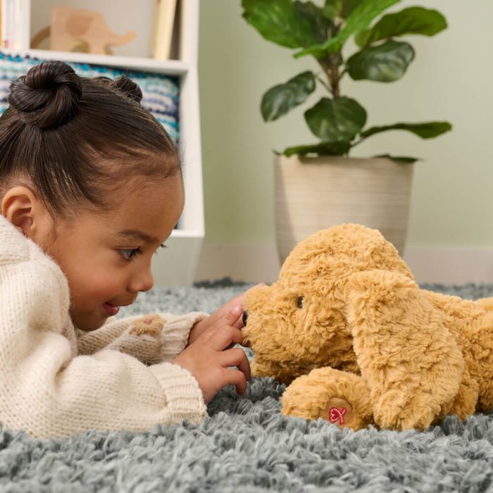 Muttsy is waiting for his forever home! This adorable Labrador puppy plush features swirls of slightly shaggy, textured amber fur, long, floppy ears, and a relaxed position that makes him look ready for playtime or naptime! You may notice a special new feature on Muttsy puppy. As part of GUND’s Forever Friends collection, Muttsy has a red stitch heart on his left paw. This stitch is GUND’s universal symbol of connection and the love someone feels when holding their favourite stuffed friend. This provides extra security for on-the-go play and all types of adventures. As your Forever Friend, this this loveable dog is ready for anything!