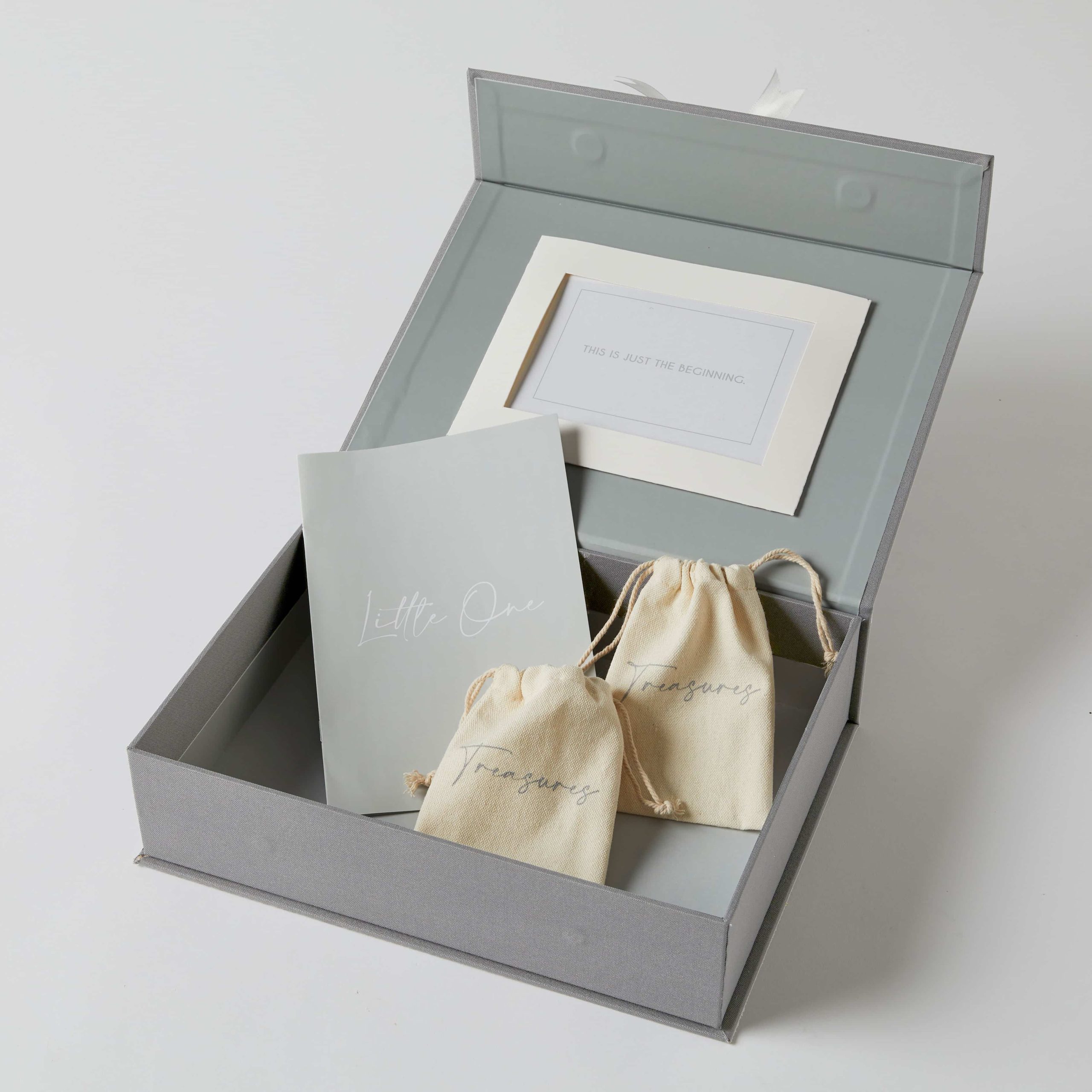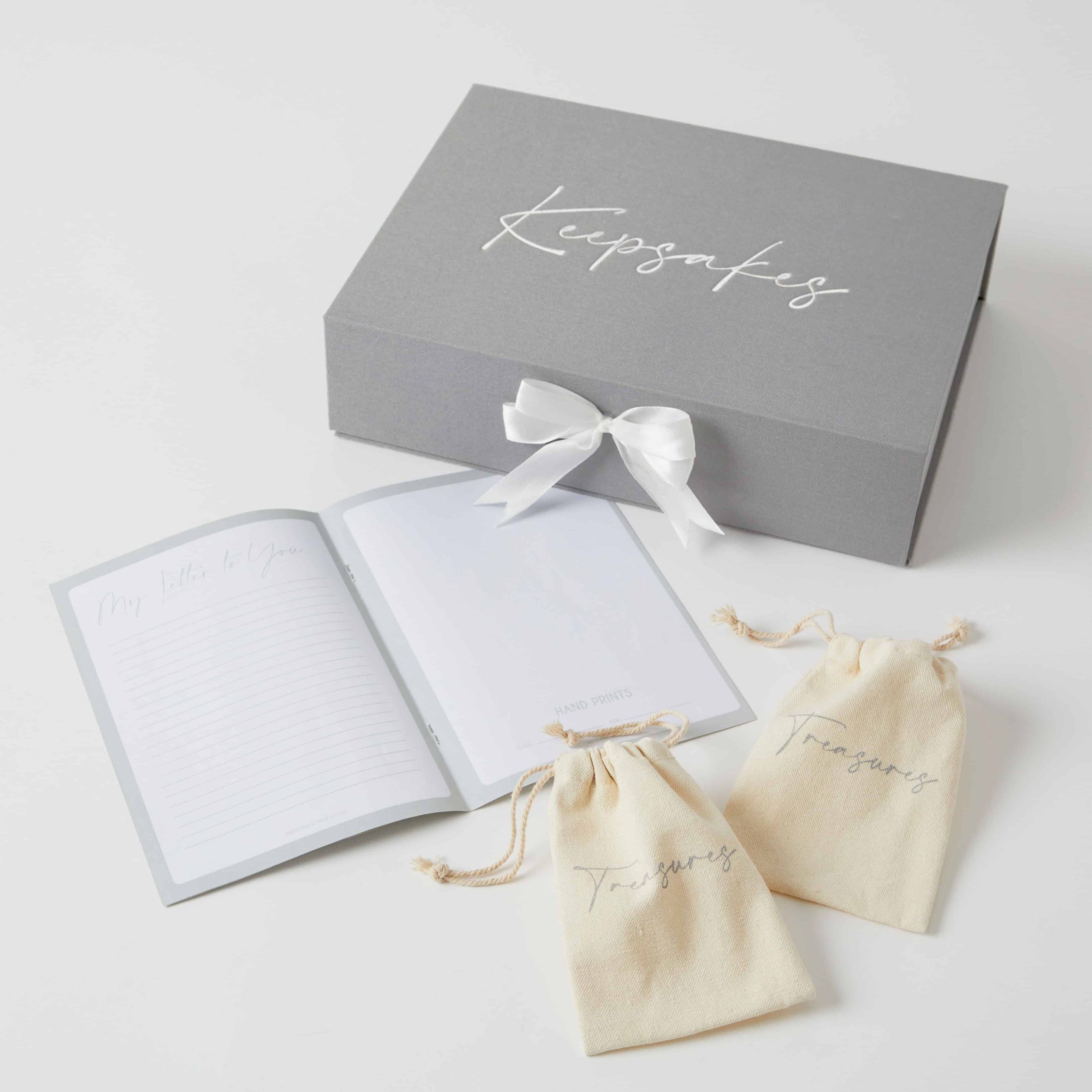 Use this fabric covered embossed box with ribbon, to safely store baby keepsakes which will be treasured forever. Includes two drawer string cotton pouches, a notebook and inner frame. Packaged in shrink wrap with info card.