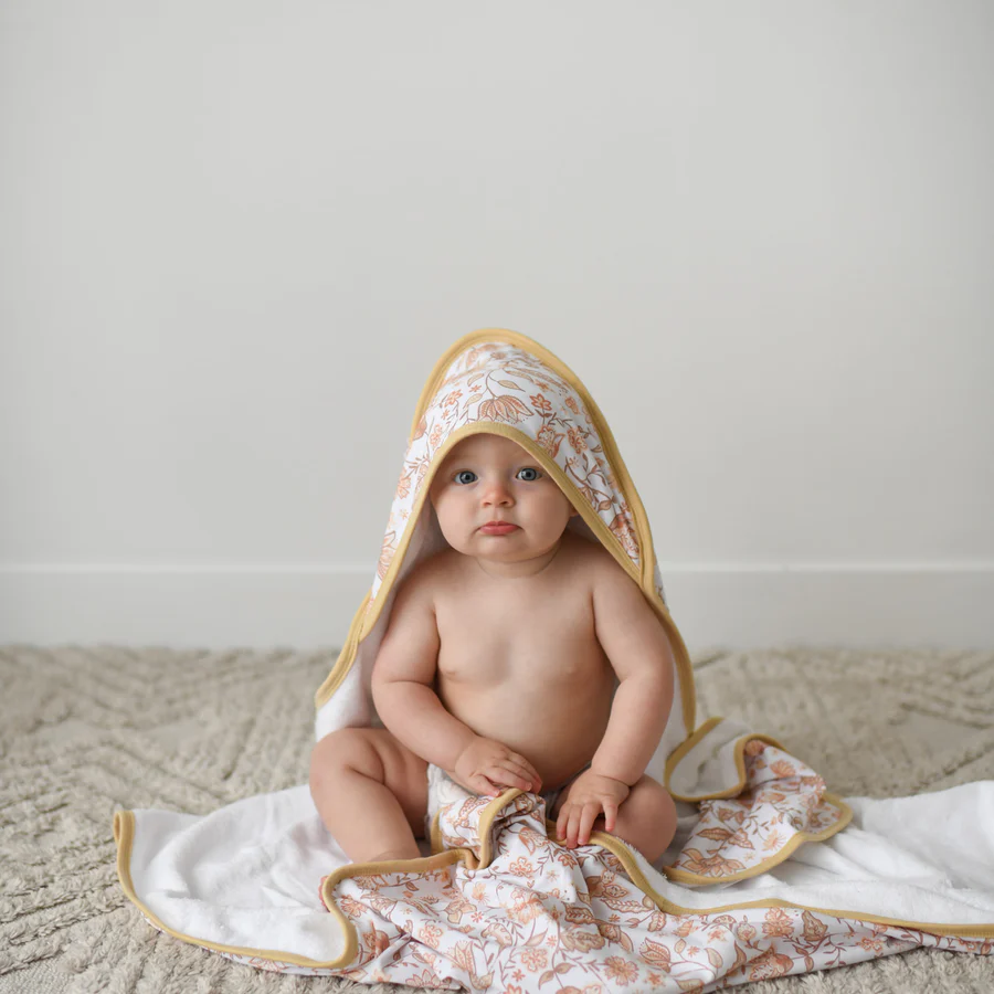 Dry off baby after a lovely bath with this hooded bath towel set containing a beautiful luscious and thick bamboo Terry towel and a washcloth backed with organic cotton jersey. The ears are adding extra cuteness! Beautiful bohemian floral pattern. Please note this print is more muted in colour compared to the clothing / accessories items.