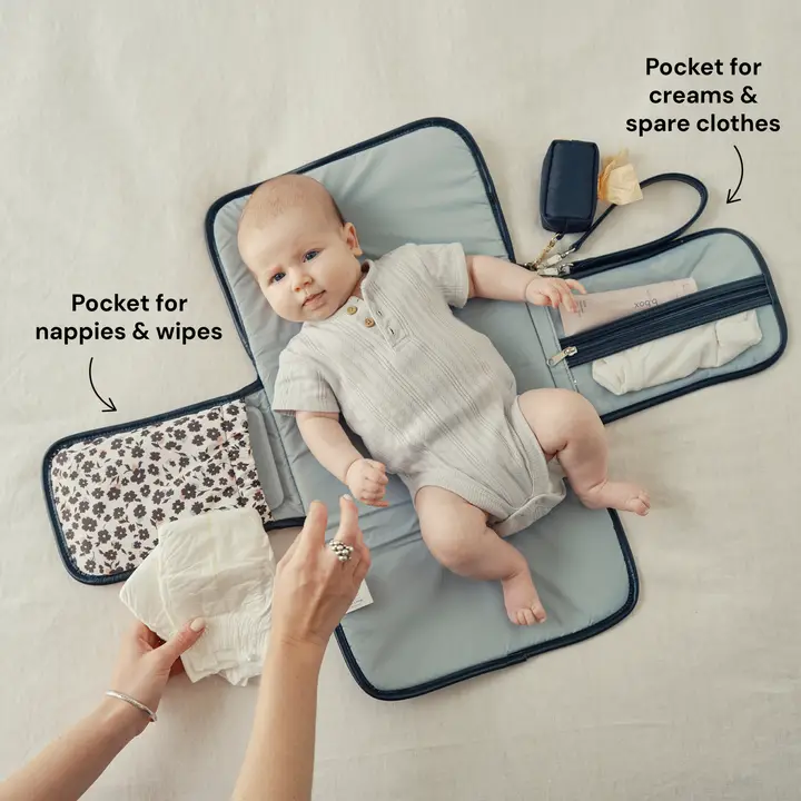 Our best-selling clutch folds out to reveal a padded mat to change baby’s nappy on the go, a storage pocket for your nappies and a zip compartment for wipes & creams.