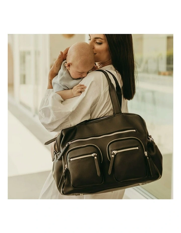 It can be worn over your shoulder, cross-body style with the included messenger strap or be clipped onto your pram using the provided stroller clips.