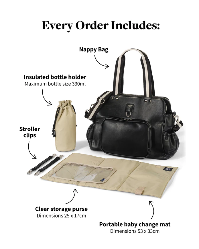 Includes large padded wipeable change mat, insulated bottle holder, clear zip purse and two stroller straps
