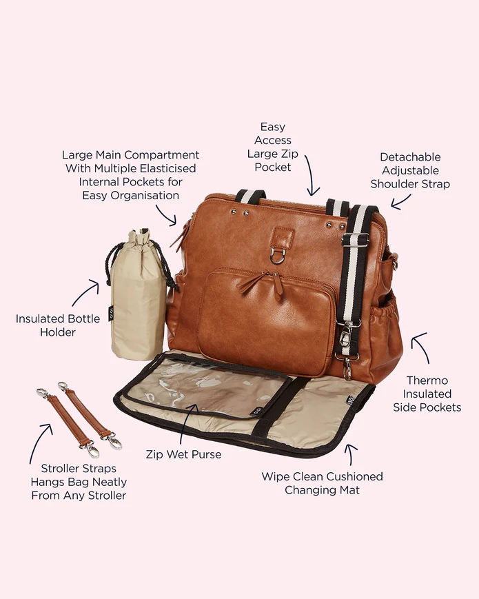 Versatile: you can wear it over your shoulder like a fashion handbag, cross-body using the detachable stripe messenger strap or clip it onto your pram using the complimentary pram straps