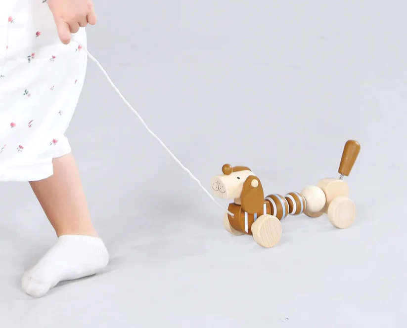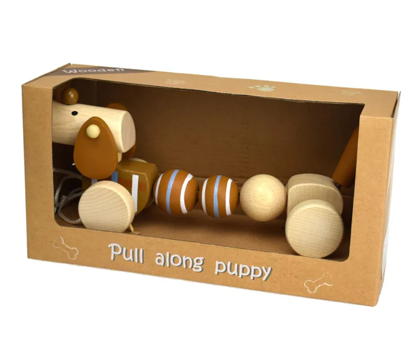 As your child learns to walk, why not give him/her this delightful pull along dog. A great toy to encourage walking. Made with natural beech wood, painted with a brown body, tail, and brown droopy ears. Comes with stable wheels and wiggling body which make pulling along the house fun. A great companion for your little one.