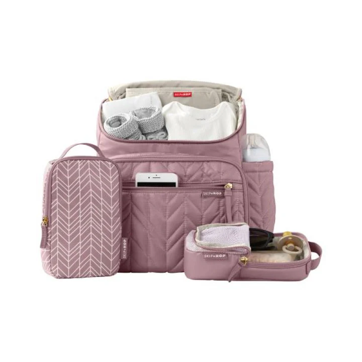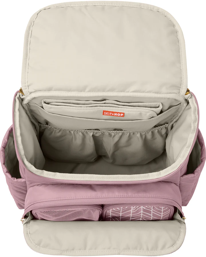 This lightweight, quilted backpack offers hands-free convenience and special packing cubes for babys essentials. The spacious interior has room to tote everything from snacks to spare outfits and the extra wide opening makes it easy to find essentials in a pinch. The front compartment includes 2 multi-purpose packing cubes and allows for extra storage. Everything stays in reach with elasticized interior pockets and insulated side bottle pockets. The changing pad pocket performs double-duty, acting as a laptop holder when traveling. With the Forma backpack, function meets fashion to take you from birth to toddlerhood and beyond in style.