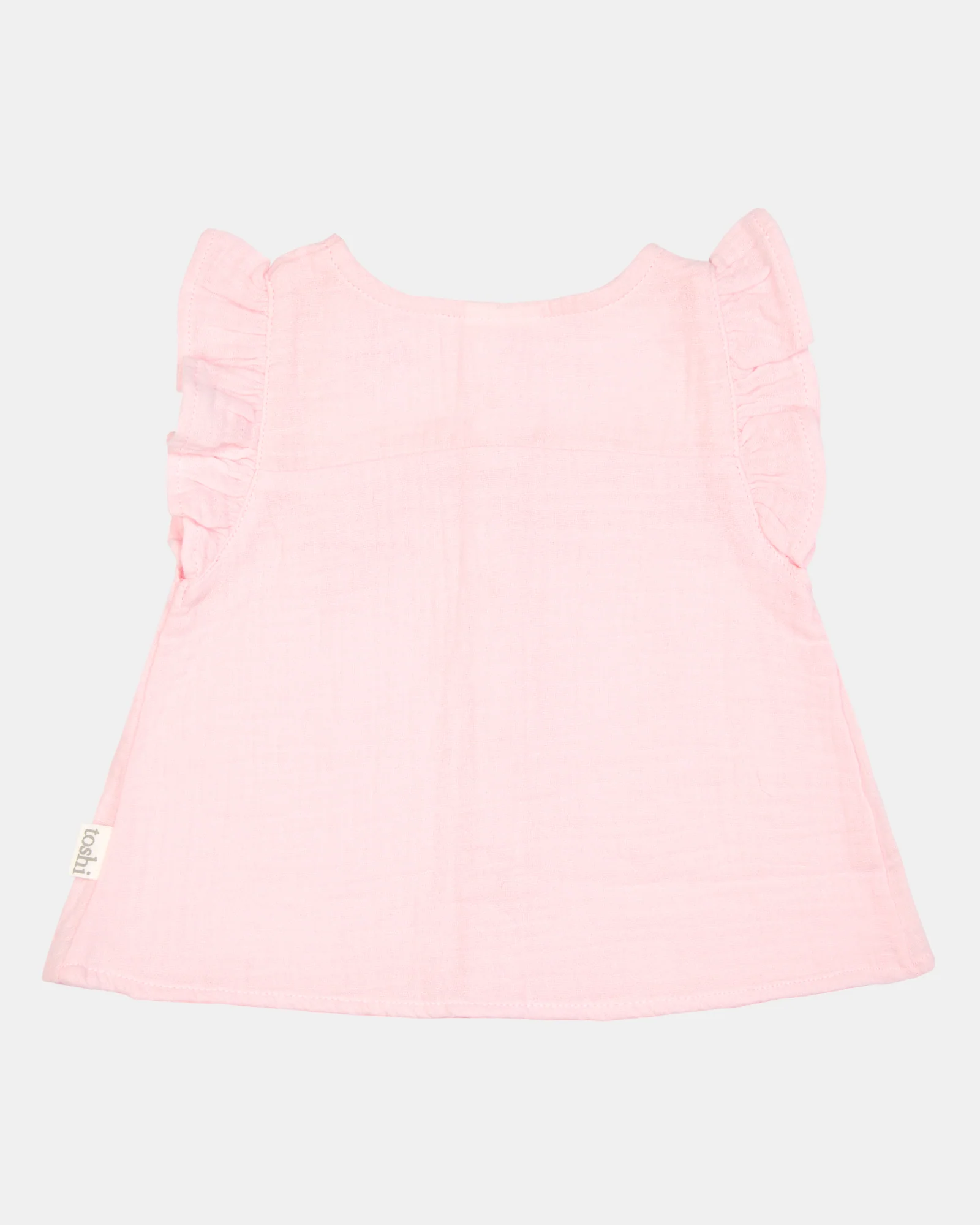 Toshi Top Frilled Sammy is crafted from the finest quality certified 100% organic cotton yarn. The cheesecloth fabrication features a supremely soft and gently nurturing texture. The classic colours create wardrobe staples, and are ideal for layering and transeasonal styling. The A-line shape is flattering and comfortable, with space for freedom of movement. Feature frill creates a playful and charming touch. The Toshi Top has front-opening press studs for easy dressing and undressing. The beautiful Toshi Baby Top transitions effortlessly from casual occasions to special celebrations.
