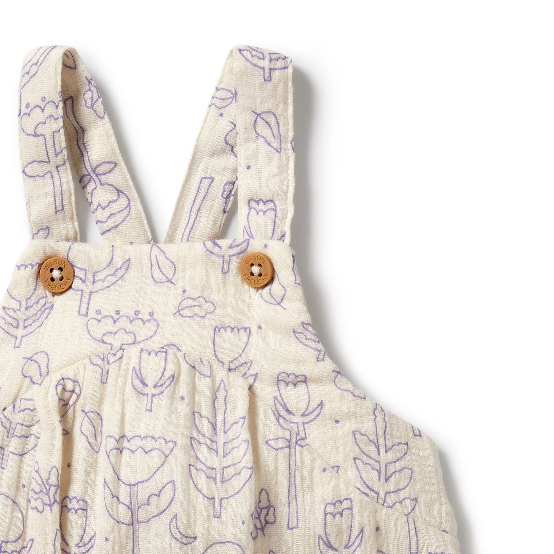 Key Features: Adjustable shoulder straps. Soft elasticated leg opening. Mock wood buttons. Roomy fit. Snap leg closure for easy nappy changes. Made with GOTS certified organic cotton. Sustainably produced. Packaged in a bio-degradable bag.