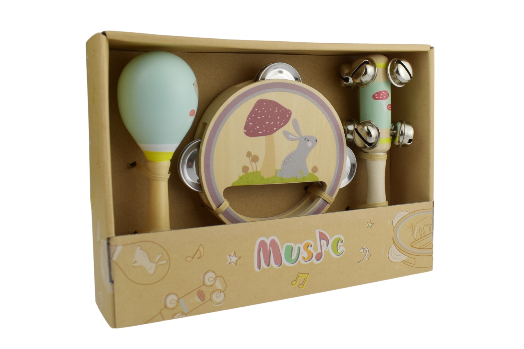 The perfect boxed set of 3 musical instruments featuring cute woodland animal designs from Calm & Breezy by Kaper Kidz. In this gift pack set you will get 3 assorted musical instruments including 1 maraca, 1 bell stick and 1 tambourine for small children to shake and learn to make music. This set includes 4 different woodland animal designs including a rabbit, deer, hedgehog or fox. This pack of 8 includes 2 sets of each design. By shaking and playing, children develop their sense of rhythm, hand-eye coordination and fine motor skills. By listening to the gentle and soothing tones each instrument makes, they get to explore sound and their sense of the world around them. Each wooden 3pc Woodland Animals Music set from Calm & Breezy by Kaper Kidz is made from timber and finished to the highest quality and painted in child safe, non toxic paint.