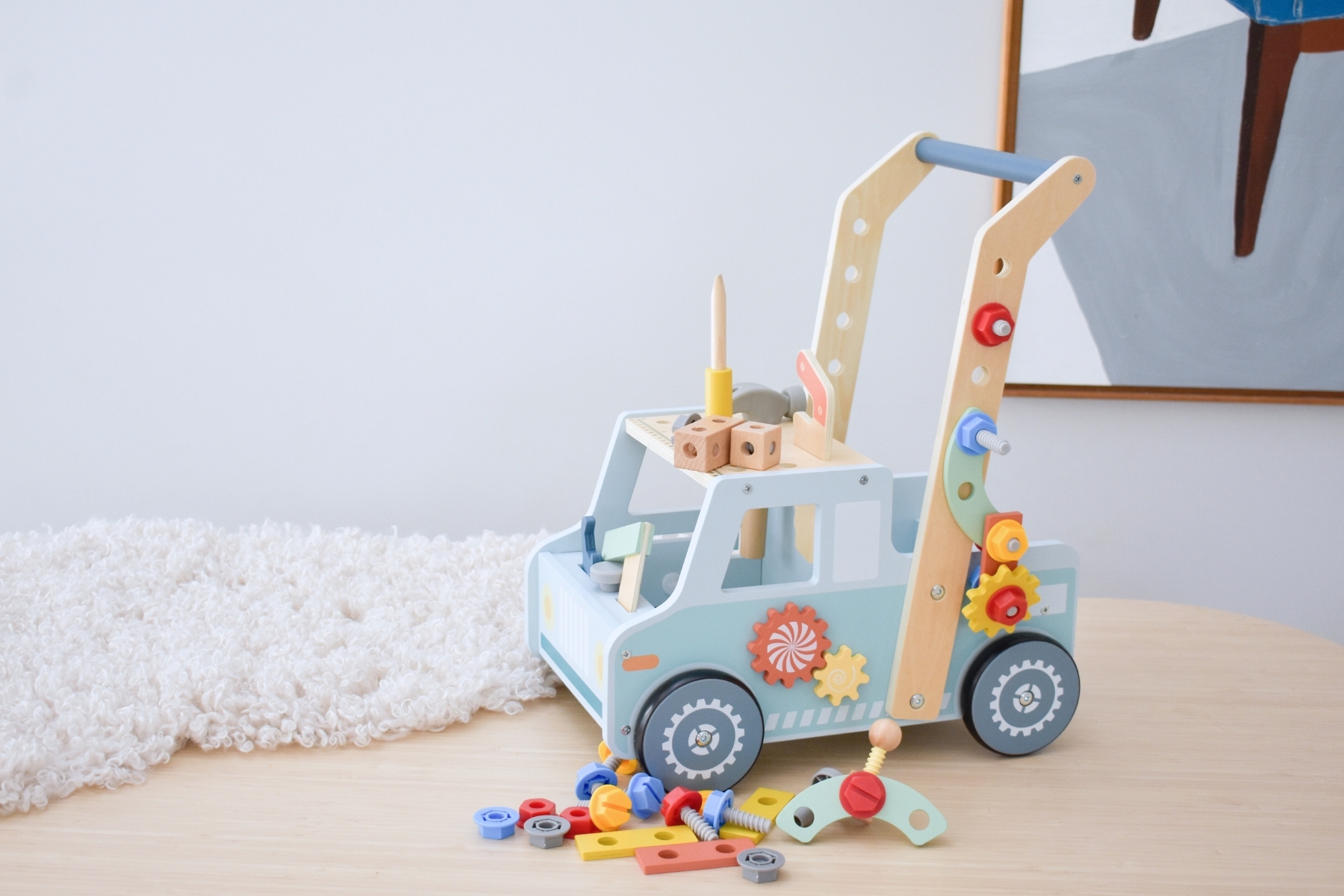 The truck features interactive elements such as moving cogs and a mini maze, adding to the play experience. A handy tray at the back provides convenient storage for all the tools and parts. Painted in muted blue tones with non toxic, child safe paint, and crafted from FSC certified timber, this walker is designed to be both safe and durable. Ideal for building confidence and strength while walking, the Tool Bench Truck Push Walker ensures that playtime is engaging and educational.